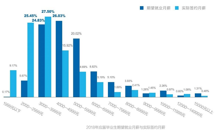 与2017年的调研数据相比,2018年应届毕业生的期望月薪相对有所提高,而实际签约月薪的分布情况基本保持一致。由此可以发现,虽然在生活成本、物价上涨等因素的影响下,高校毕业生的期望薪资水平也随之上涨,但实际签约的薪资水平没有发生明显变化,在当前宏观经济相对复杂的大环境下,用人单位对于应届毕业生的签约薪资不会发生实质改变,毕业生对薪酬水平的期望需要保持相对理性。