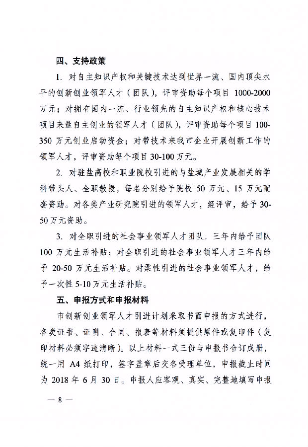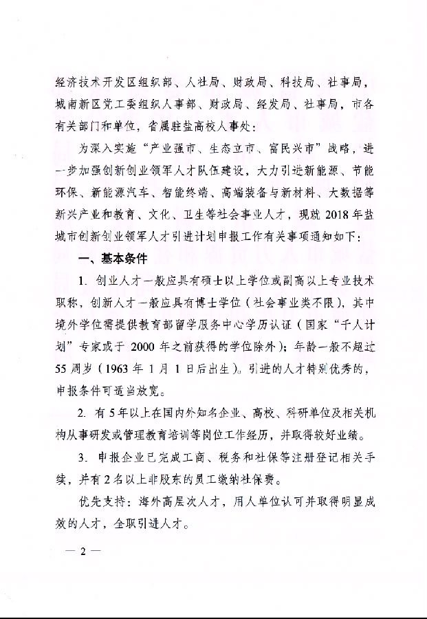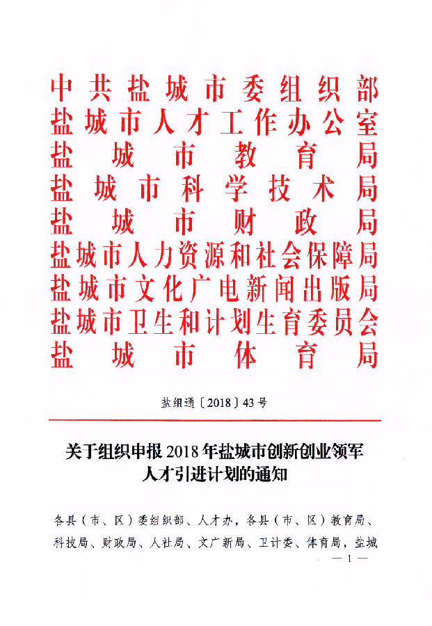 关于组织申报2018年盐城市创新创业领军人才引进计划的通知
